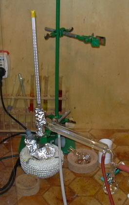 Destillation der Produktmischung im Vakuum. Man beachte die Isolation des linken Teils der Apparatur mit Alufolie.