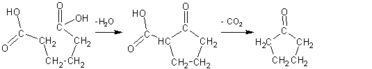 As can be seen from the above formula row, 2-cyclopentancarboxylic acid is produced from adipic acid via ester condensation. This is, as is typical for ß-keto acids, very susceptible to the loss of carbon dioxide. To be precise, it is the respective barium salt which, of course, reacts under the chosen reaction conditions. That the ester condensation does not lead to polymers is easily explained by the fact that on the one hand a particularly stable five-membered ring is formed by the intramolecular reaction and on the other that the involved atoms necessarily (favorably) lie close to one another in the intramolecular reaction. One compares this with the behavior of other dicarboxylic acids.